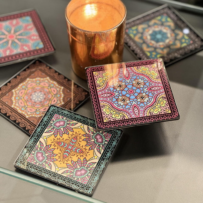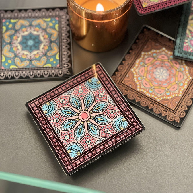 The Coasters - Mandala Zazu Black (Set of 4) feature a bold black backdrop with striking mandala accents for a modern yet rooted aesthetic.