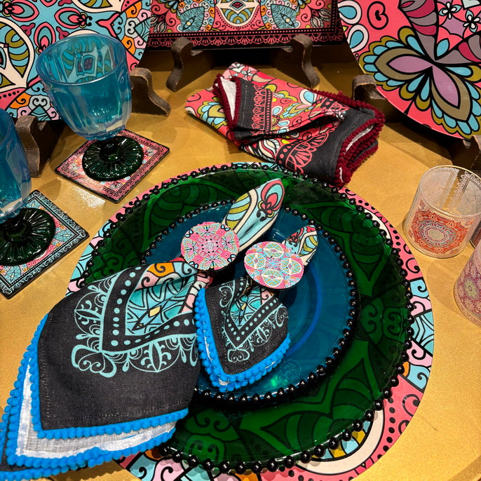 Make every meal memorable with the Napkin Sets - Mandala Obasi Black Rings (Set of 4), featuring a jet-black finish and traditional Mandala detailing.