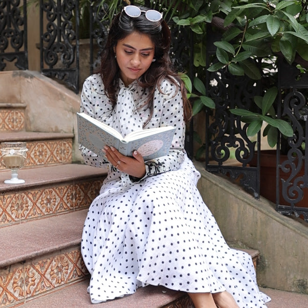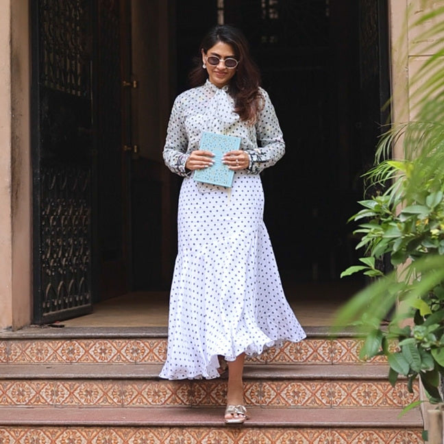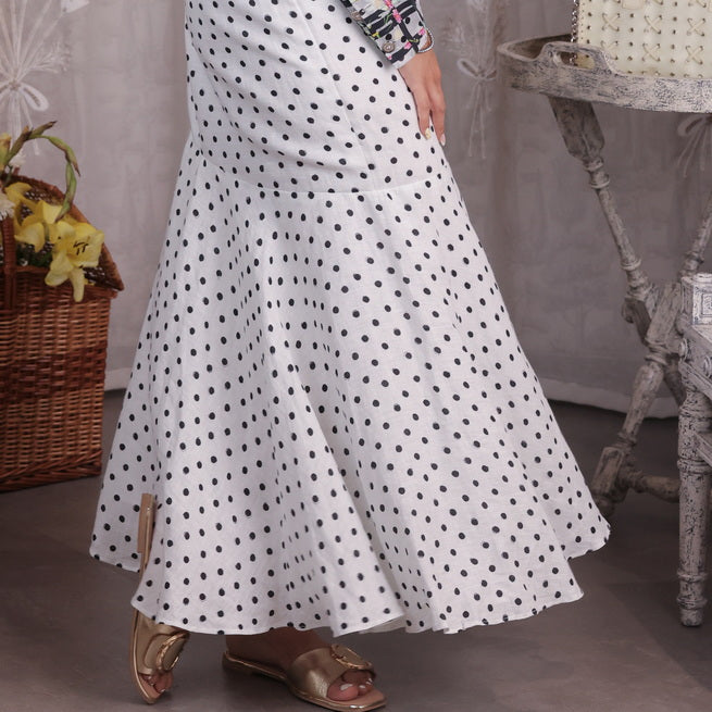 A flattering fusion of structure and movement, this bias-cut skirt hugs in all the right places and flows beautifully with every step. The playful black polka dots add timeless charm, while the gathered lower layer brings flair and volume. A wardrobe essential for any season.