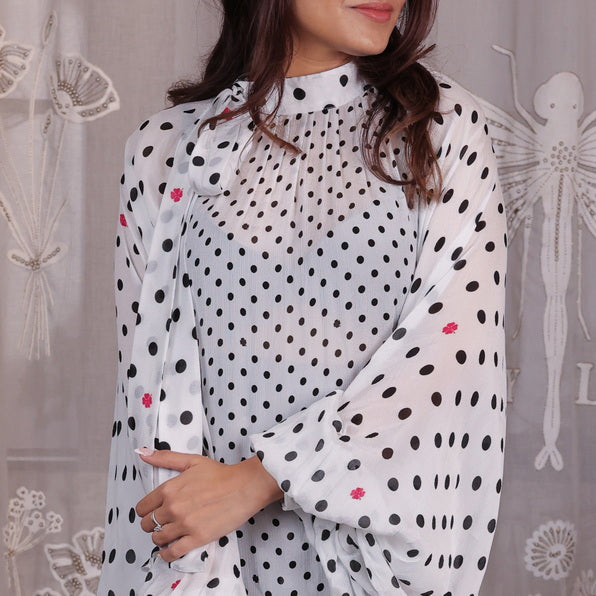 This statement top brings classic polka charm with a breezy, feminine silhouette. Designed with soft pleats along the neckline and full-length gathered raglan sleeves, it offers comfort and style in equal measure. A fabric bow tie at the neck adds a playful touch, while the voluminous sleeves give it an airy elegance.