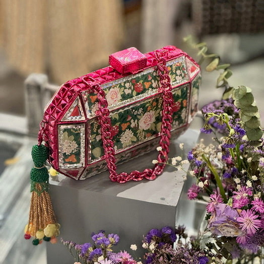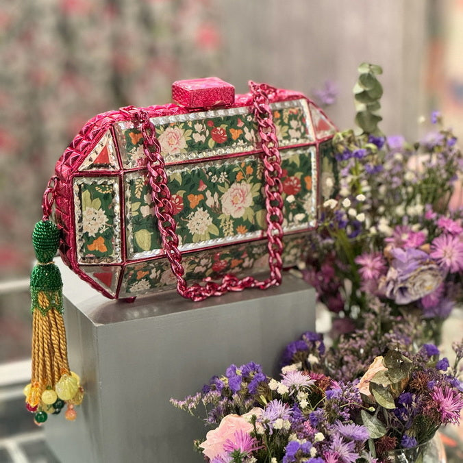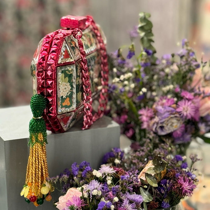 The Bloom Royale clutch is a vibrant celebration of floral romance. With a lush green backdrop and delicate mirror panels, it’s crowned by a radiant pink frame and finished with a bold green-yellow beaded tassel. A showstopper for garden soirées and festive evenings alike.