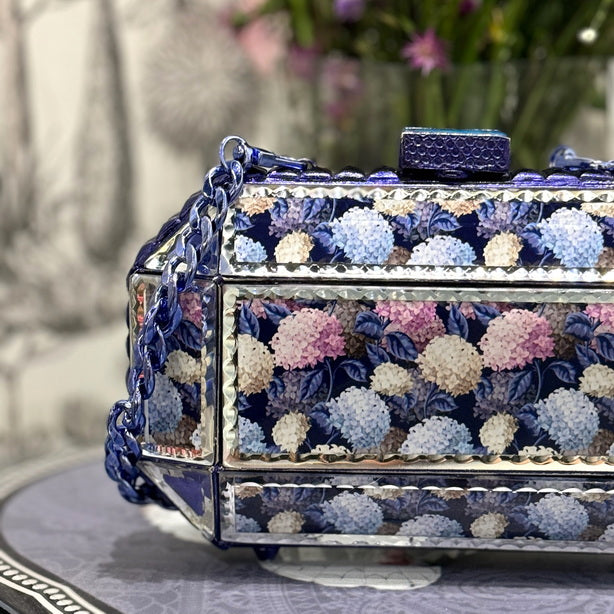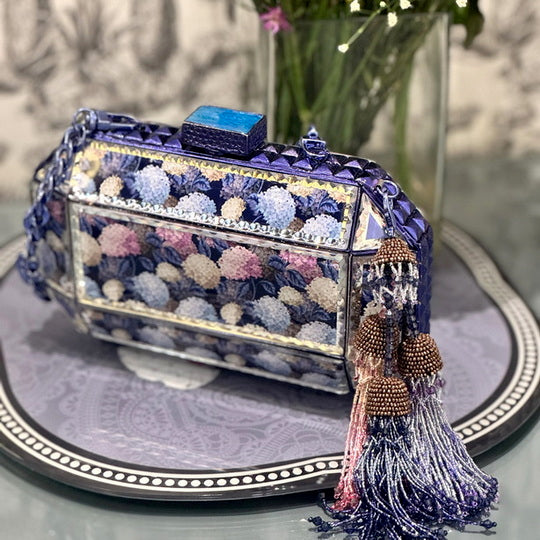 A poetic ode to garden elegance, the Hydrangea Bloom clutch brings together rich hues of blue, lilac, and blush in a bouquet of serenity.