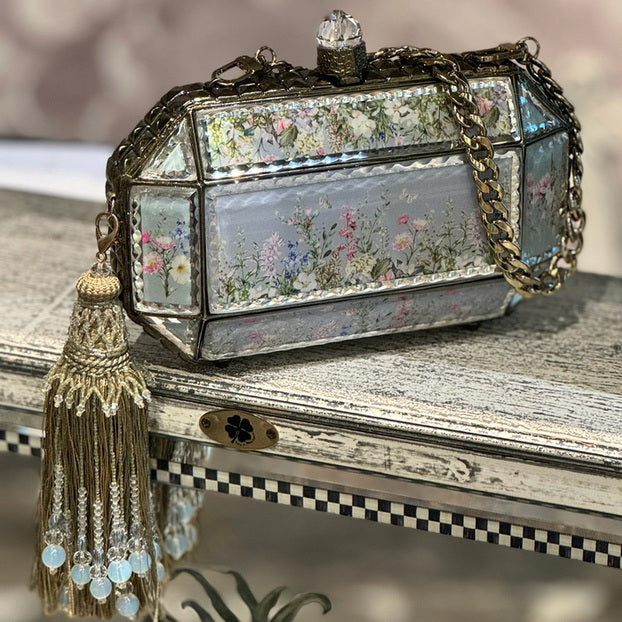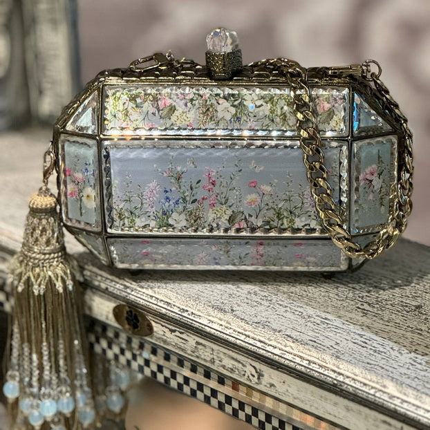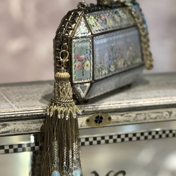 Ethereal and elegant, the Misty Garden clutch evokes the serenity of an early morning bloom. With delicate floral artwork set against cool tones and encased in beveled mirrors, this piece is adorned with a handcrafted golden thread tassel and a silver metal chain. A quiet stunner made for those who love subtle statement pieces.