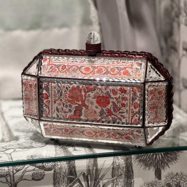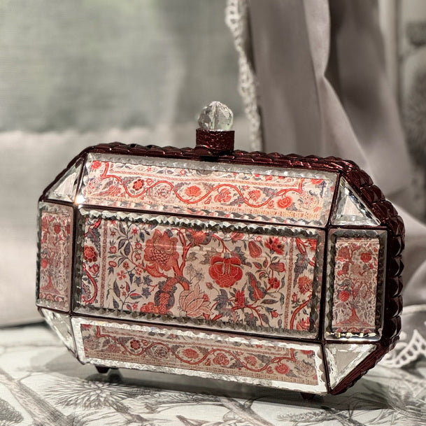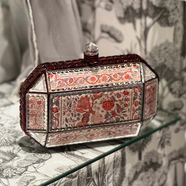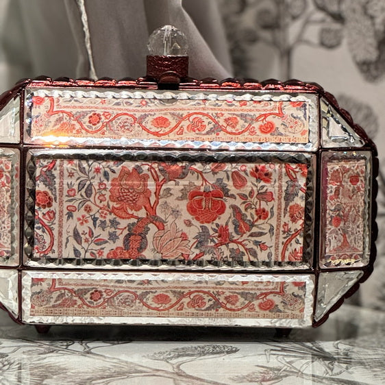 A bold and timeless statement piece, the Scarlet Mosaic clutch from our Prismatic collection showcases intricate red floral patterns set against reflective beveled mirror panels.