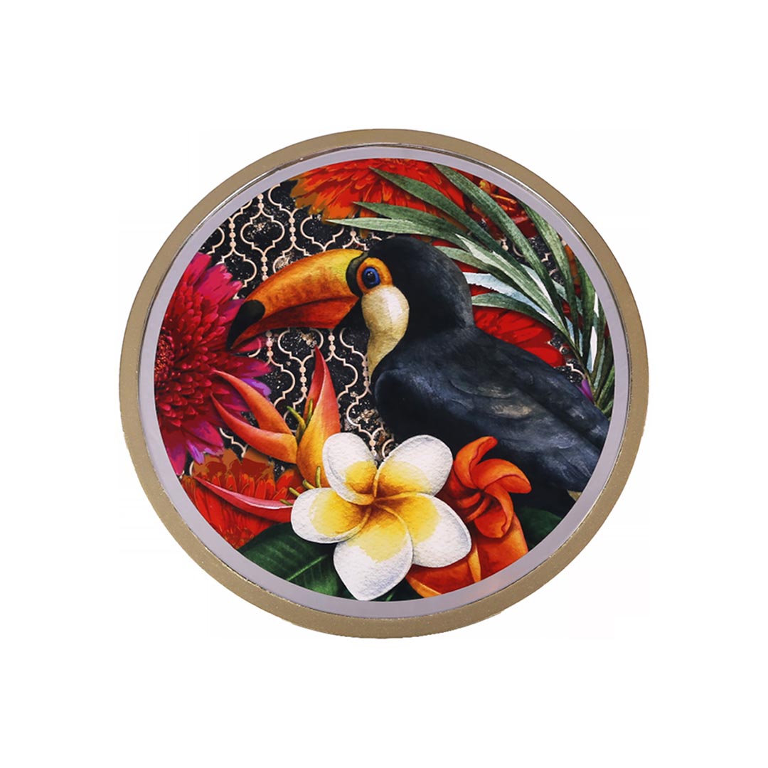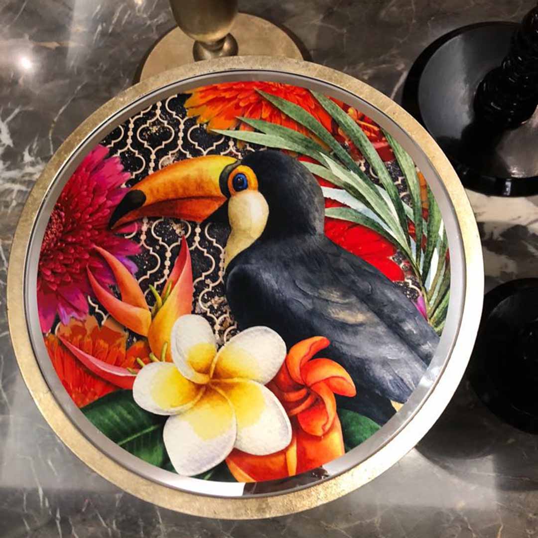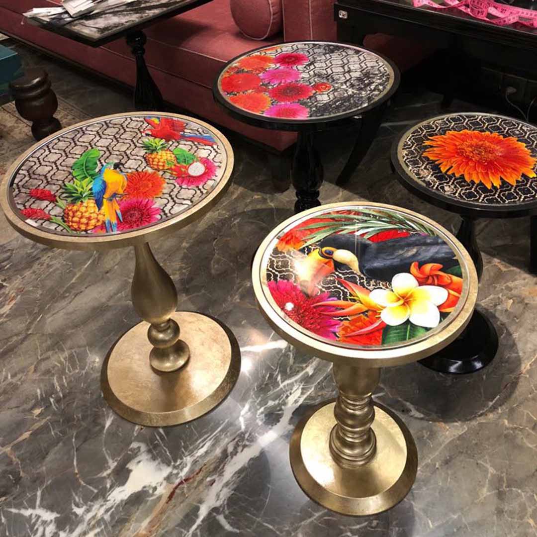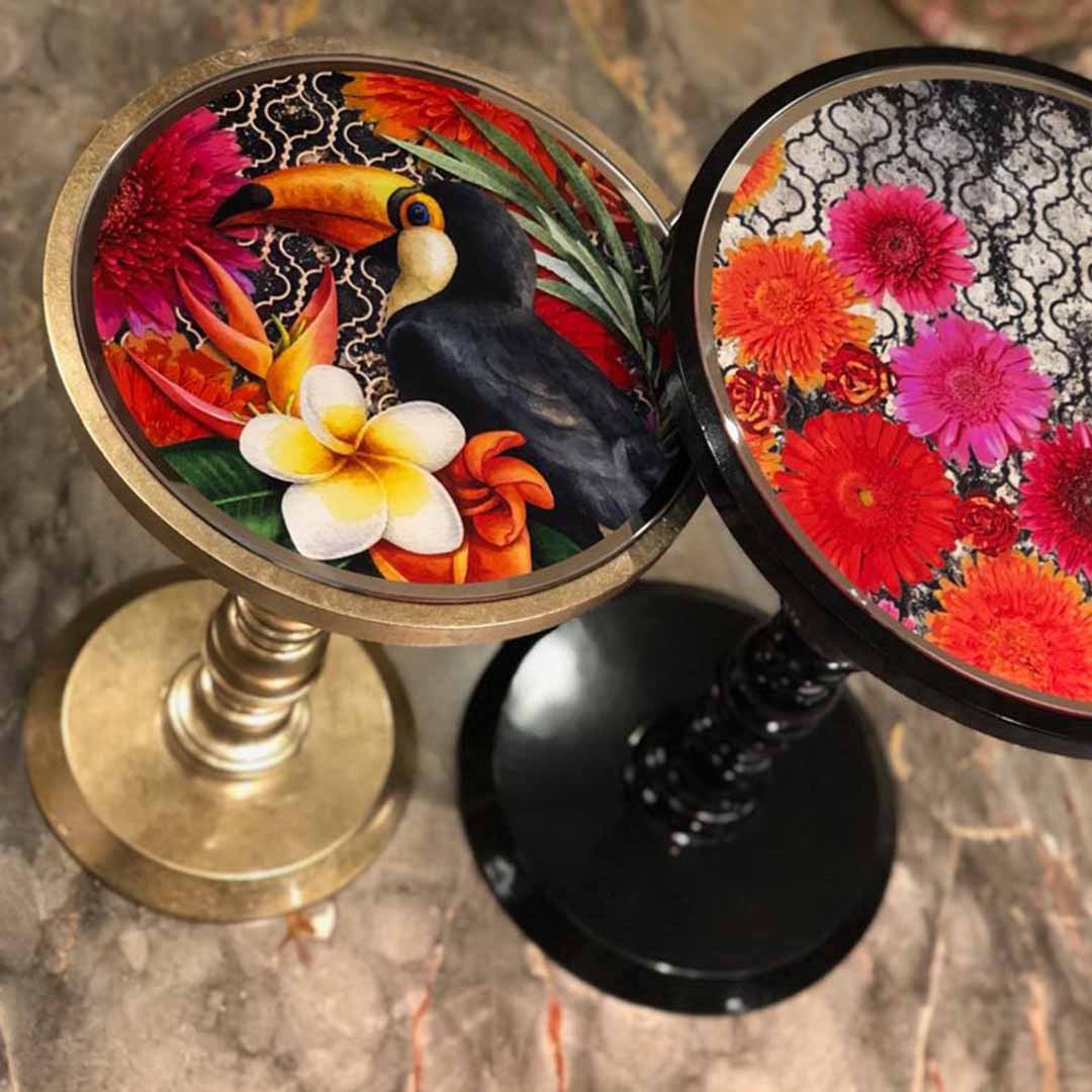 The Brandt Round Side Table mixes baroque-style patterns with bold prints for a sophisticated touch. Its deep gold base anchors the design beautifully.