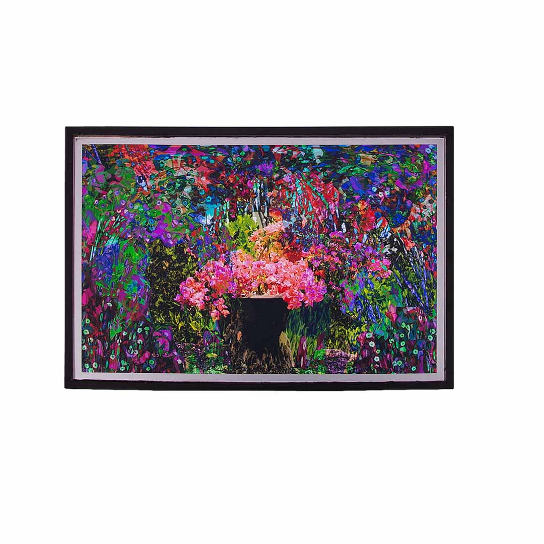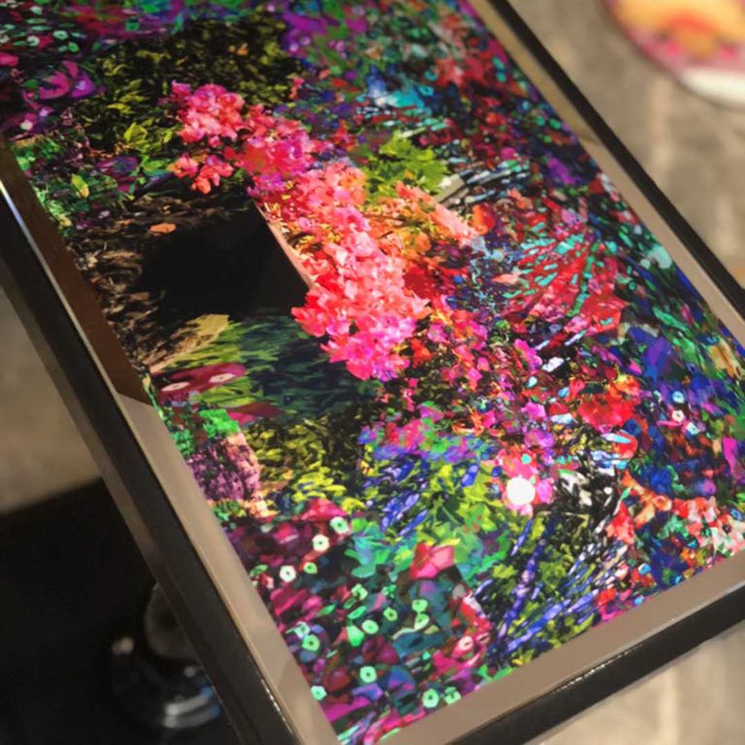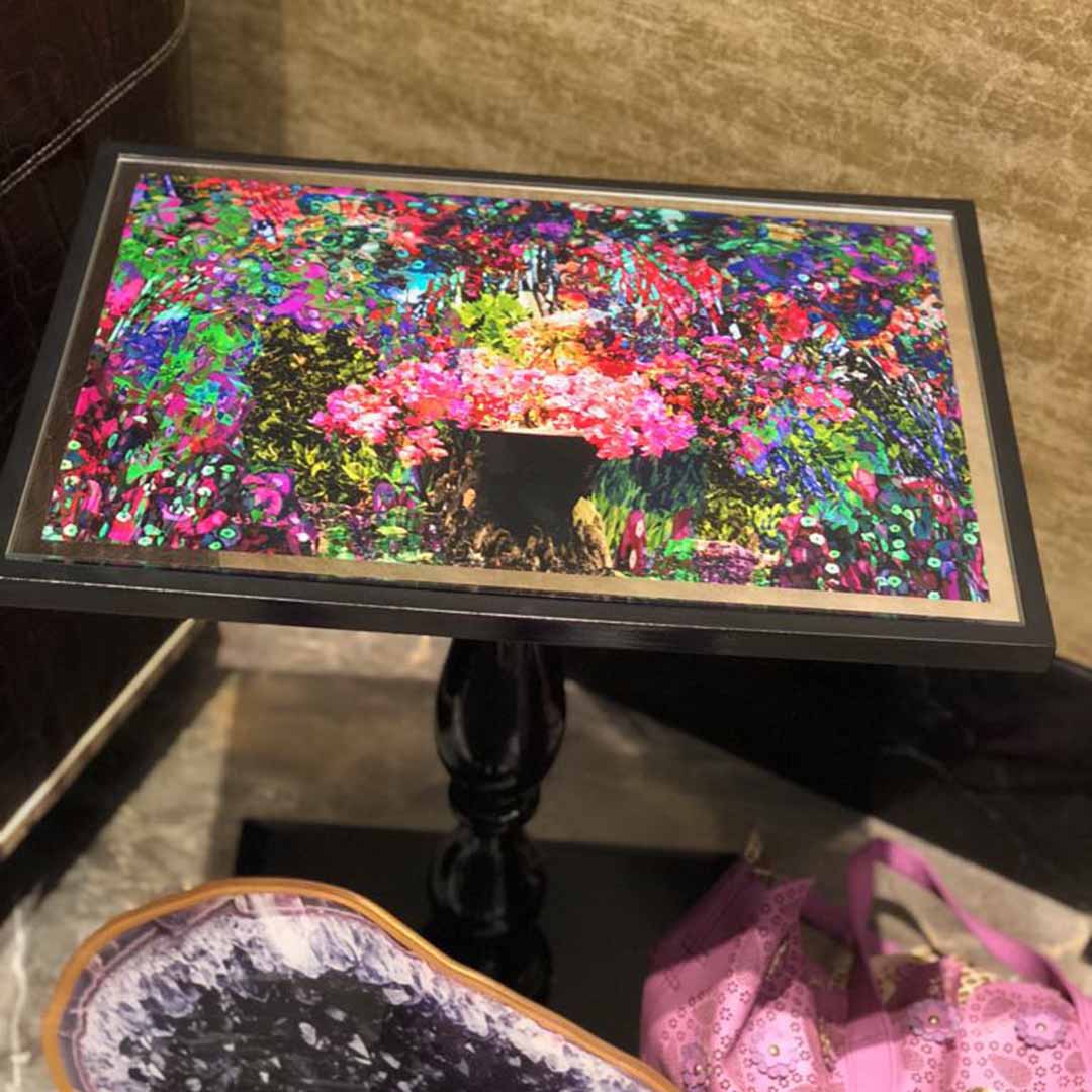 The Moira Rectangle Side Table brings an abstract floral scape to life with a blend of purples. Balanced on a polished black base, it’s a bold addition to spaces that love a little drama.