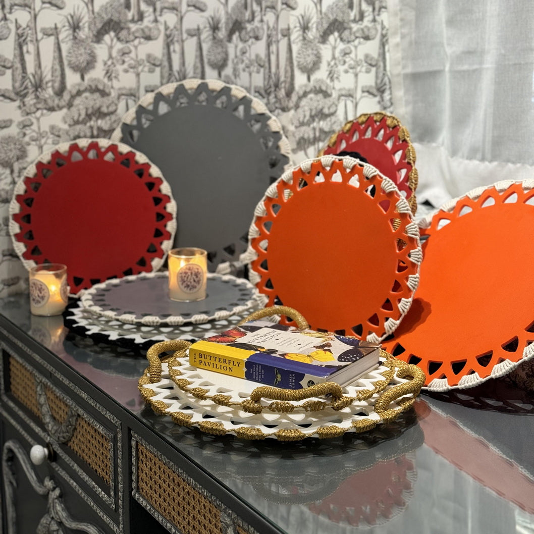 The Picnic Macrame Ivory & Gold Tray captures elegance in its simplest form — handcrafted macrame wrapped around a refined corian base. Perfect for adding a soft glow to your décor or serving with grace.
